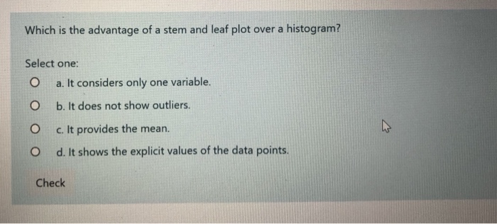 Stem-and-Leaf Plots with Decimals | Overview, Method & Purpose - Video ... Stem and Leaf. The main components of a stem-and-leaf plot are the title, the stem column, the leaf column, and the key. Title. The title of a stem plot tells what the diagram is about.. Stem. The ... Stem and Leaf Plot - Online Math Learning Stem and Leaf Plots and Measures of Central Tendency Learn about stem and leaf plots and measures of central tendency Try the free Mathway calculator and problem solver below to practice various math topics. Try the given examples, or type in your own problem and check your answer with the step-by-step explanations.